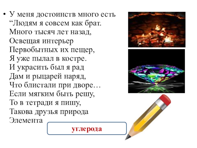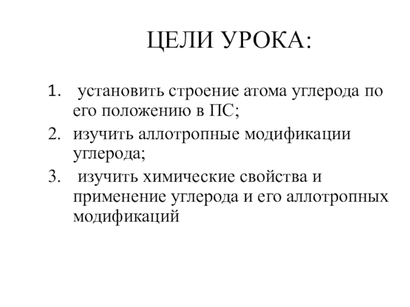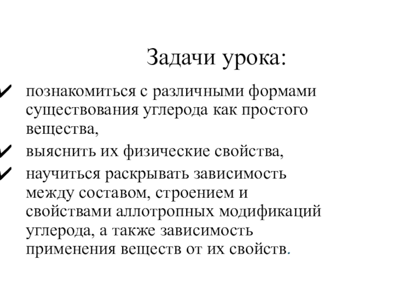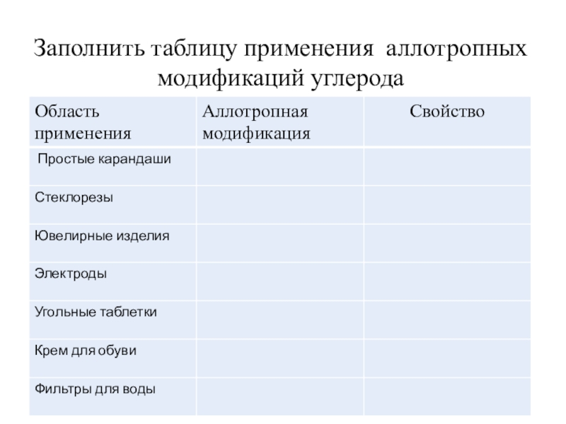 научиться раскрывать зависимость между составом, строением и свойствами аллотропных модификаций углерода, а также зависимость применения веществ от их свойств.