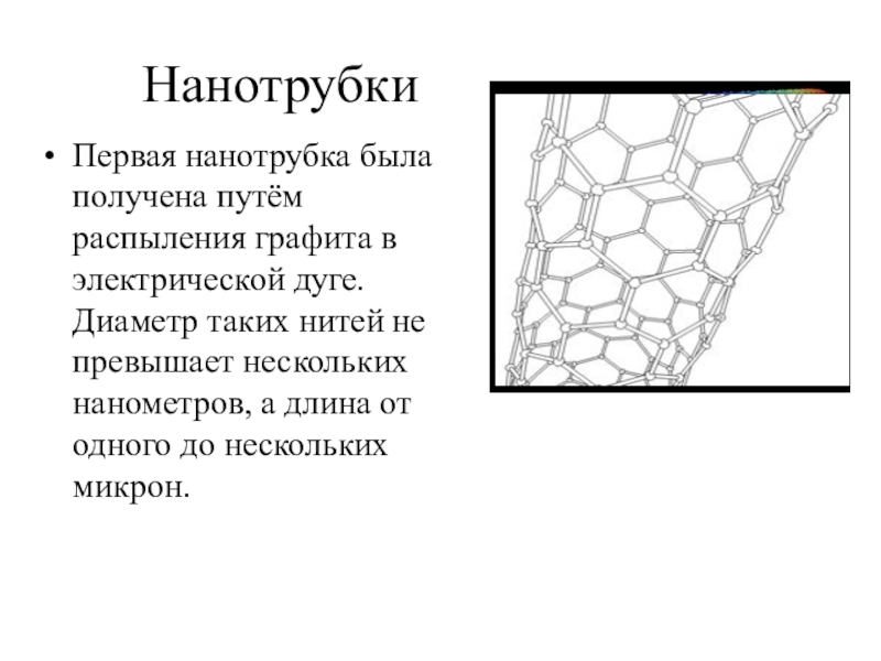 Первая нанотрубка была получена путём распыления графита в электрической дуге. Диаметр