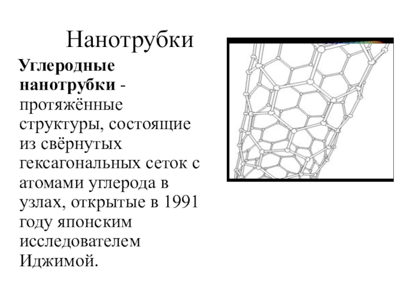 Слайд 54 Углеродные нанотрубки - протяжённые структуры, состоящие из свёрнутых гексагональных