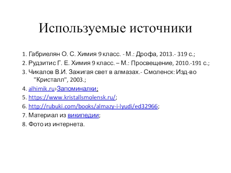 2. Рудзитис Г. Е. Химия 9 класс. – М.: Просвещение, 2010.-191 с.;