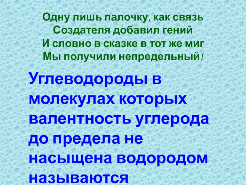 Углеводороды в молекулах которых валентность углерода до предела не насыщена водородом называются непредельными.
