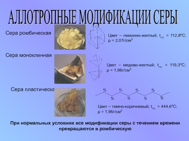 При нормальных условиях все модификации серы с течением времени превращаются в ромбическую