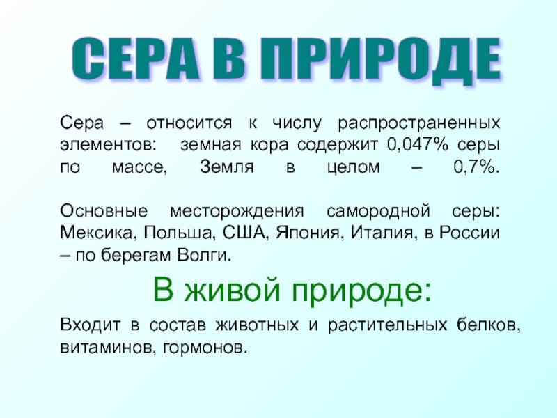 Сера – относится к числу распространенных элементов: земная кора содержит 0,047% серы по массе, Земля в целом – 0,7%.