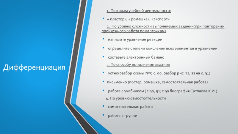 Дифференциация   1. По видам учебной деятельности:« кластер», «