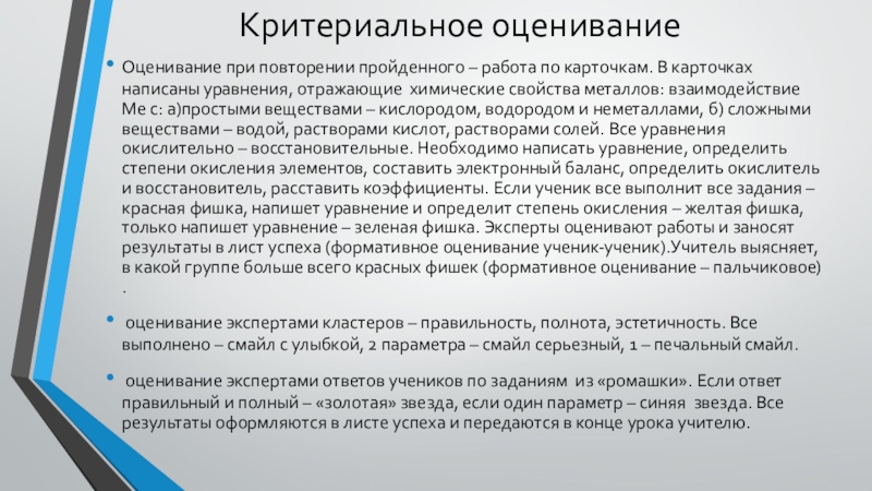Критериальное оцениваниеОценивание при повторении пройденного – работа по карточкам. В карточках написаны уравнения, отражающие химические свойства металлов: