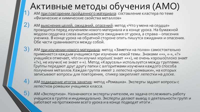 АМ при изучении нового материала: метод «Заметки на полях» самостоятельно применяется каждым учащимся при изучении новой темы. Знаками «+», «-», «?» учащийся отмечает, что он изучил хорошо( знает «+»), не очень хорошо(плохо знает «?»), не изучил( не знает «-»). Метод «Карусель» используется между группами. Группы передают друг другу папки с алгоритмами изучения каждого способа получения металлов.Каждая группа имеет 2 лепестка «ромашки», на которых записывают вопросы для повторения, спикер закрепляет лепестки на доске.