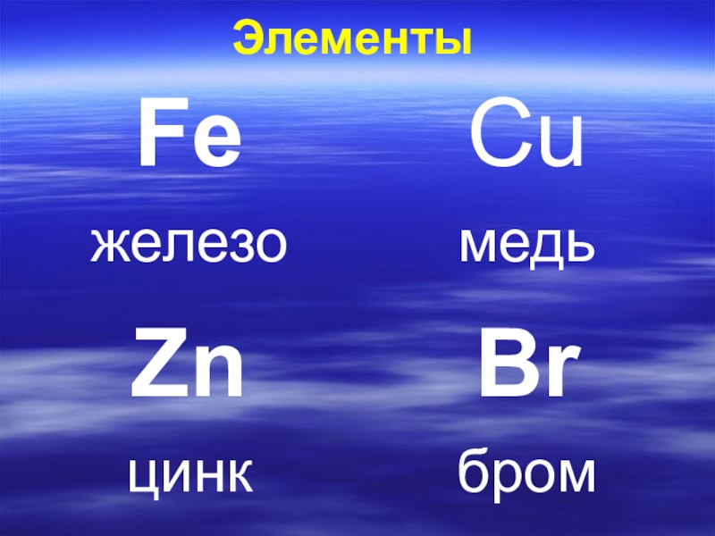 Элементы FeжелезоCuмедьZnцинкBrбром