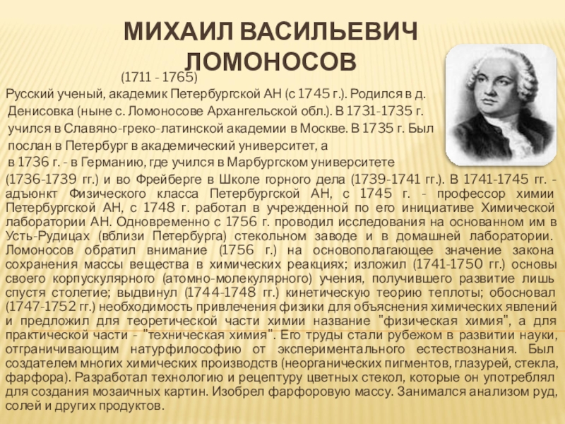 (1736-1739 гг.) и во Фрейберге в Школе горного дела (1739-1741 гг.). В 1741-1745 гг. - адъюнкт Физического класса Петербургской АН, с 1745 г. - профессор химии Петербургской АН, с 1748 г. работал в учрежденной по его инициативе Химической лаборатории АН. Одновременно с 1756 г. проводил исследования на основанном им в Усть-Рудицах (вблизи Петербурга) стекольном заводе и в домашней лаборатории. Ломоносов обратил внимание (1756 г.) на основополагающее значение закона сохранения массы вещества в химических реакциях; изложил (1741-1750 гг.) основы своего корпускулярного (атомно-молекулярного) учения, получившего развитие лишь спустя столетие; выдвинул (1744-1748 гг.) кинетическую теорию теплоты; обосновал (1747-1752 гг.) необходимость привлечения физики для объяснения химических явлений и предложил для теоретической части химии название "физическая химия", а для практической части - "техническая химия". Его труды стали рубежом в развитии науки, отграничивающим натурфилософию от экспериментального естествознания. Был создателем многих химических производств (неорганических пигментов, глазурей, стекла, фарфора). Разработал технологию и рецептуру цветных стекол, которые он употреблял для создания мозаичных картин. Изобрел фарфоровую массу. Занимался анализом руд, солей и других продуктов.