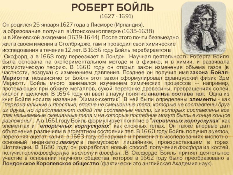 Оксфорд, а в 1668 году переезжает в Лондон. Научная деятельность Роберта Бойля была основана на экспериментальном методе и в физике, и в химии, и развивала атомистическую теорию. В 1660 году он открыл закон изменения объема газов (в частности, воздуха) с изменением давления. Позднее он получил имя закона Бойля-Мариотта: независимо от Бойля этот закон сформулировал французский физик Эдм Мариотт. Бойль много занимался изучением химических процессов -- например, протекающих при обжиге металлов, сухой перегонке древесины, превращениях солей, кислот и щелочей. В 1654 году он ввел в науку понятие анализа состава тел. Одна из книг Бойля носила название "Химик-скептик". В ней были определены элементы - как "первоначальные и простые, вполне не смешанные тела, которые не составлены друг из друга, но представляют собой те составные части, из которых составлены все так называемые смешанные тела и на которые последние могут быть в конце концов разложены". А в 1661 году Бойль формулирует понятие о "первичных корпускулах" как элементах и "вторичных корпускулах" как сложных телах. Он также впервые дал объяснение различиям в агрегатном состоянии тел. В 1660 году Бойль получил ацетон, перегоняя ацетат калия, в 1663 году обнаружил и применил в исследованиях кислотно-основный индикатор лакмус в лакмусовом лишайнике, произрастающем в горах Шотландии. В 1680 году он разработал новый способ получения фосфора из костей, получил ортофосфорную кислоту и фосфин... В Оксфорде Бойль принял деятельное участие в основании научного общества, которое в 1662 году было преобразовано в Лондонское Королевское общество (фактически это английская Академия наук).