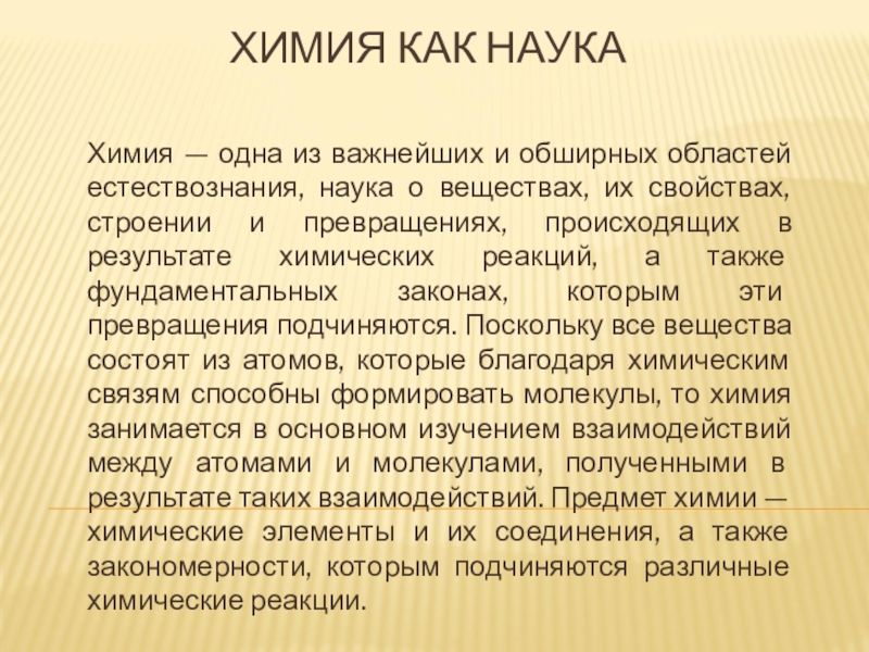 наука о веществах, их свойствах, строении и превращениях, происходящих в результате химических реакций, а также фундаментальных законах, которым эти превращения подчиняются. Поскольку все вещества состоят из атомов, которые благодаря химическим связям способны формировать молекулы, то химия занимается в основном изучением взаимодействий между атомами и молекулами, полученными в результате таких взаимодействий. Предмет химии — химические элементы и их соединения, а также закономерности, которым подчиняются различные химические реакции.