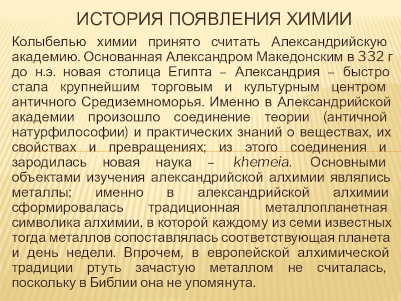 г до н.э. новая столица Египта – Александрия – быстро стала крупнейшим торговым и культурным центром античного Средиземноморья. Именно в Александрийской академии произошло соединение теории (античной натурфилософии) и практических знаний о веществах, их свойствах и превращениях; из этого соединения и зародилась новая наука – khemeia. Основными объектами изучения александрийской алхимии являлись металлы; именно в александрийской алхимии сформировалась традиционная металлопланетная символика алхимии, в которой каждому из семи известных тогда металлов сопоставлялась соответствующая планета и день недели. Впрочем, в европейской алхимической традиции ртуть зачастую металлом не считалась, поскольку в Библии она не упомянута.
