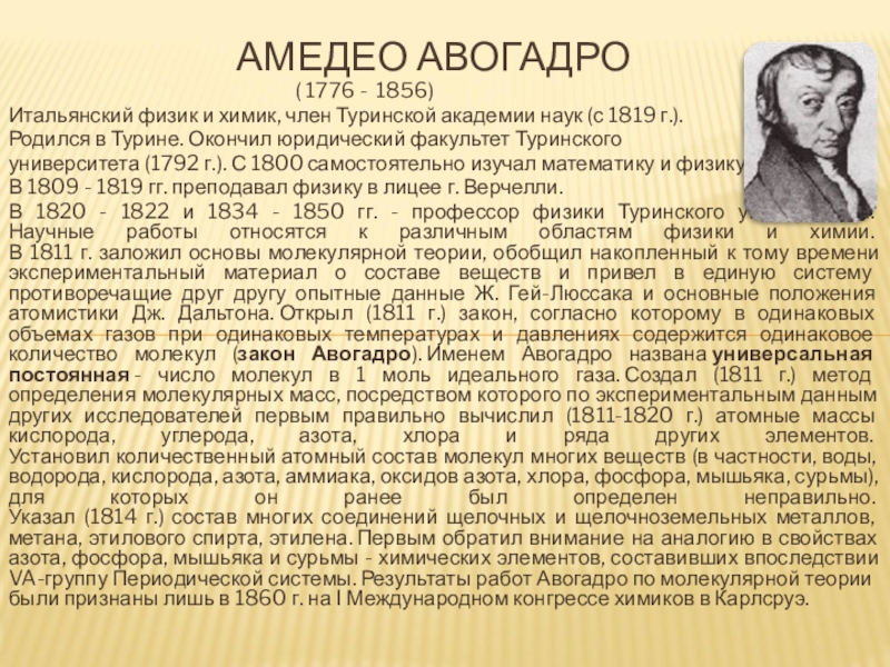 В 1811 г. заложил основы молекулярной теории, обобщил накопленный к тому времени экспериментальный материал о составе веществ и привел в единую систему противоречащие друг другу опытные данные Ж. Гей-Люссака и основные положения атомистики Дж. Дальтона. Открыл (1811 г.) закон, согласно которому в одинаковых объемах газов при одинаковых температурах и давлениях содержится одинаковое количество молекул (закон Авогадро). Именем Авогадро названа универсальная постоянная - число молекул в 1 моль идеального газа. Создал (1811 г.) метод определения молекулярных масс, посредством которого по экспериментальным данным других исследователей первым правильно вычислил (1811-1820 г.) атомные массы кислорода, углерода, азота, хлора и ряда других элементов.