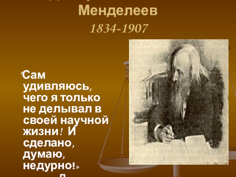 Таким он был на самом деле, Дмитрий Иванович Менделеев, великий учёный, гражданин и общественный деятель. Когда он скоропостижно скончался в 1907 г., его похороны, принятые на счет государства, были настоящим национальным трауром. "Есть люди, со смертью которых как бы умирает часть России", – отметил по поводу безвременной кончины Д.И. Менделеева известный публицист того времени М.О. Меньшиков.