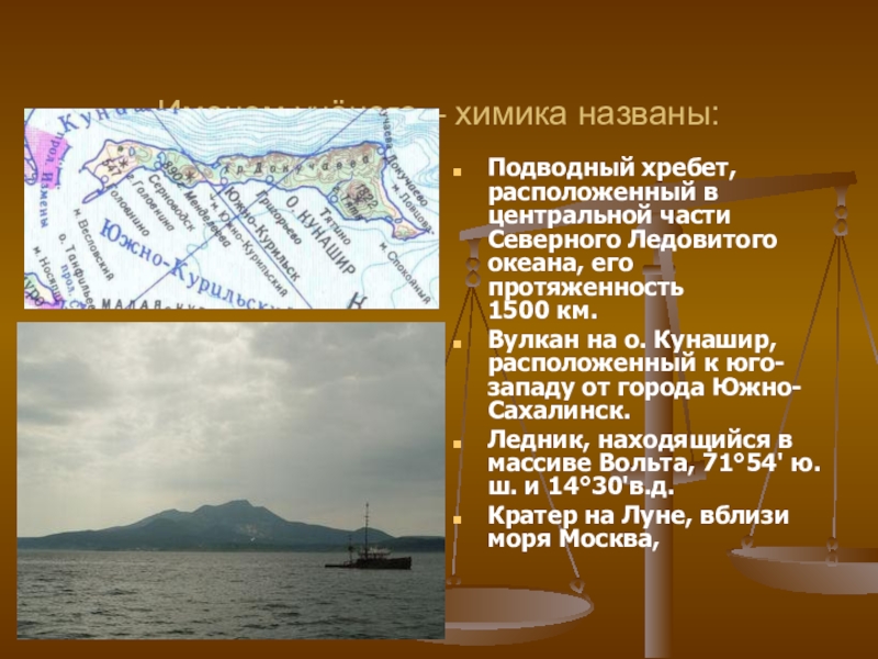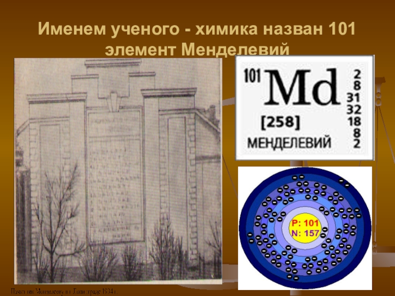 Слайд 32Именем ученого - химика назван 101 элемент Менделевий
