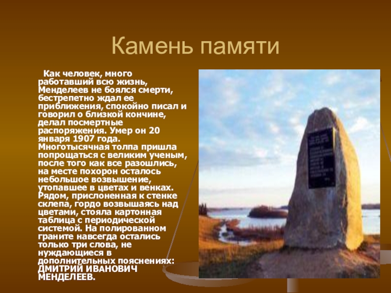 Менделеев не боялся смерти, бестрепетно ждал ее приближения, спокойно писал и говорил о близкой кончине, делал посмертные распоряжения. Умер он 20 января 1907 года. Многотысячная толпа пришла попрощаться с великим ученым, после того как все разошлись, на месте похорон осталось небольшое возвышение, утопавшее в цветах и венках. Рядом, прислоненная к стенке склепа, гордо возвышаясь над цветами, стояла картонная таблица с периодической системой. На полированном граните навсегда остались только три слова, не нуждающиеся в дополнительных пояснениях: ДМИТРИЙ ИВАНОВИЧ МЕНДЕЛЕЕВ.
