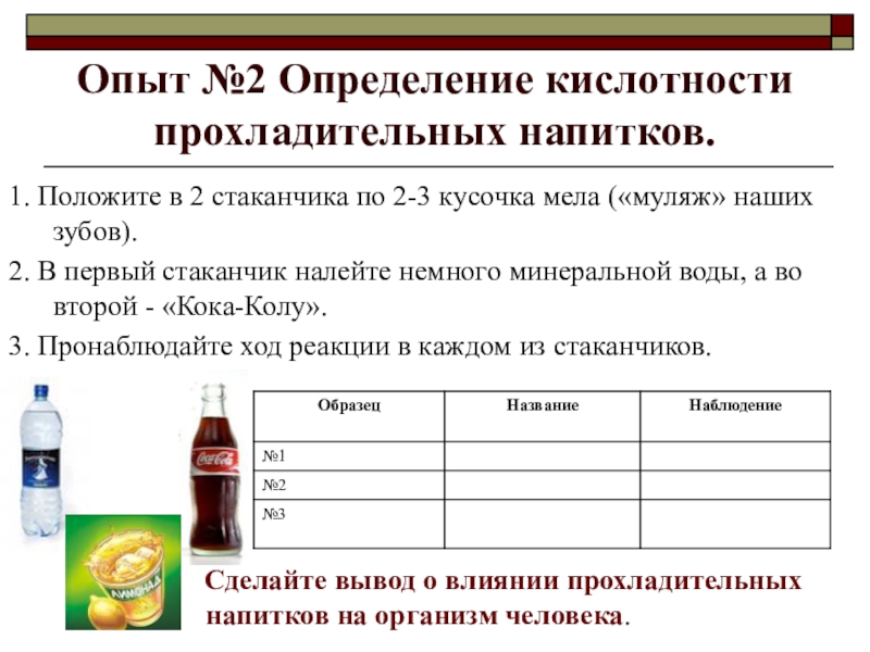 2. В первый стаканчик налейте немного минеральной воды, а во второй - «Кока-Колу».
