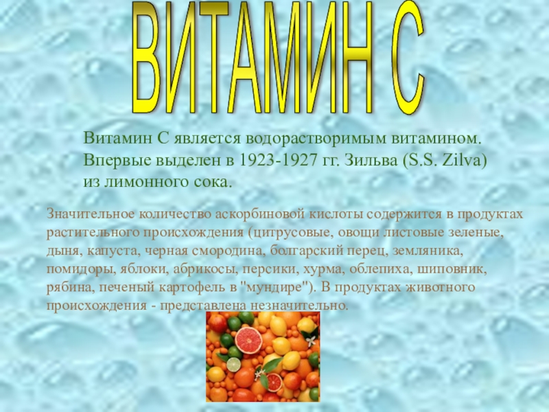 Значительное количество аскорбиновой кислоты содержится в продуктах растительного происхождения (цитрусовые, овощи листовые зеленые, дыня, капуста, черная смородина, болгарский перец, земляника, помидоры, яблоки, абрикосы, персики, хурма, облепиха, шиповник, рябина, печеный картофель в "мундире"). В продуктах животного происхождения - представлена незначительно.