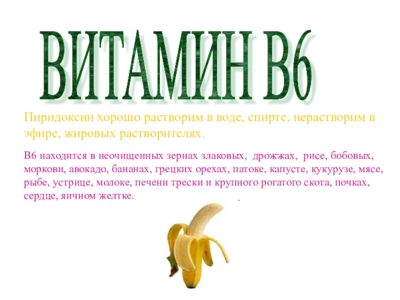 В6 находится в неочищенных зернах злаковых, дрожжах, рисе, бобовых, моркови, авокадо, бананах, грецких орехах, патоке, капусте, кукурузе, мясе, рыбе, устрице, молоке, печени трески и крупного рогатого скота, почках, сердце, яичном желтке.