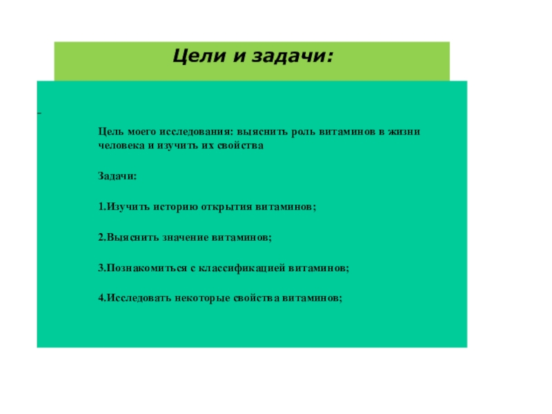 Цель моего исследования: выяснить роль витаминов в жизни человека и изучить их свойства