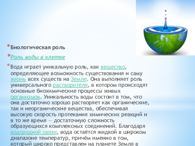 возможность существования и саму жизнь всех существ на Земле. Она выполняет роль универсального растворителя, в котором происходят основные биохимические процессы живых организмов. Уникальность воды состоит в том, что она достаточно хорошо растворяет как органические, так и неорганические вещества, обеспечивая высокую скорость протекания химических реакций и в то же время — достаточную сложность образующихся комплексных соединений. Благодаря водородной связи, вода остаётся жидкой в широком диапазоне температур, причём именно в том, который широко представлен на планете Земля в настоящее время.