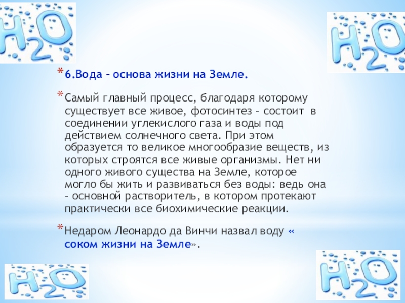 Недаром Леонардо да Винчи назвал воду « соком жизни на Земле».