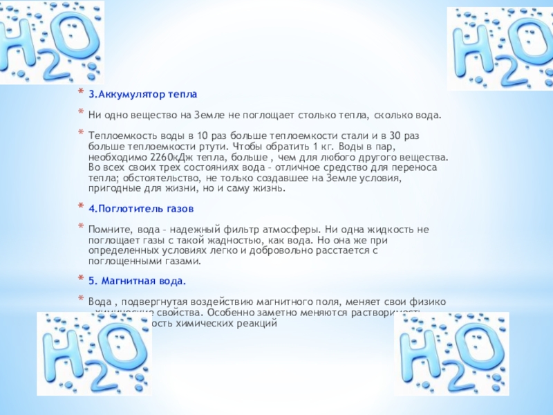 Теплоемкость воды в 10 раз больше теплоемкости стали и в 30 раз больше теплоемкости ртути. Чтобы обратить 1 кг. Воды в пар, необходимо 2260кДж тепла, больше , чем для любого другого вещества. Во всех своих трех состояниях вода – отличное средство для переноса тепла; обстоятельство, не только создавшее на Земле условия, пригодные для жизни, но и саму жизнь.