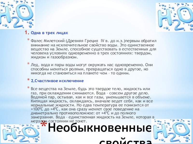 н.э.)первым обратил внимание на исключительное свойство воды. Это единственное вещество на Земле, способное существовать в естественных для человека условиях одновременно в трех состояниях: твердом, жидком и газообразном.