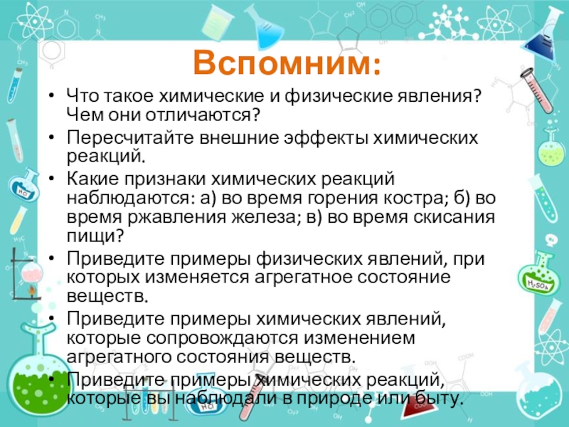 Вспомним:Что такое химические и физические явления? Чем они отличаются?Пересчитайте внешние эффекты химических реакций.Какие признаки химических реакций наблюдаются: а) во время горения костра; б) во время ржавления железа; в) во время скисания пищи?Приведите примеры физических явлений, при