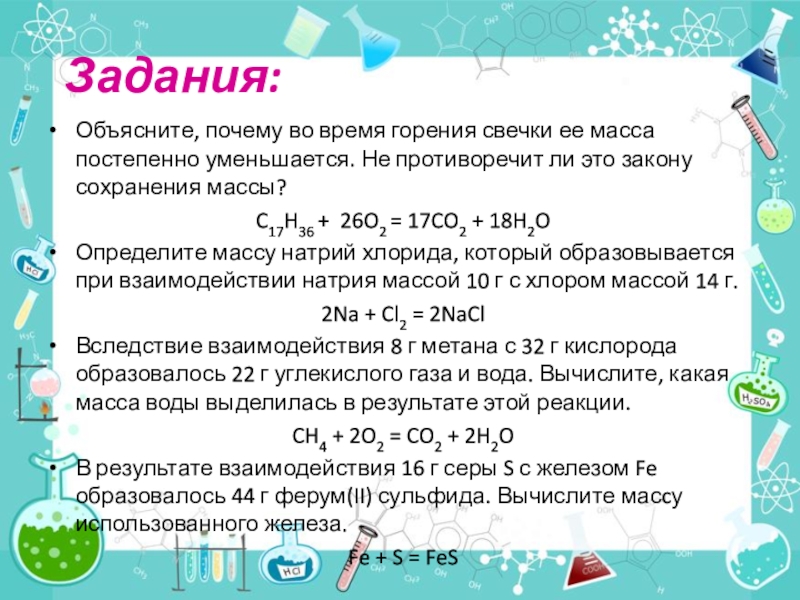 Задания:Объясните, почему во время горения свечки ее масса постепенно уменьшается. Не противоречит ли это закону сохранения массы?C17H36
