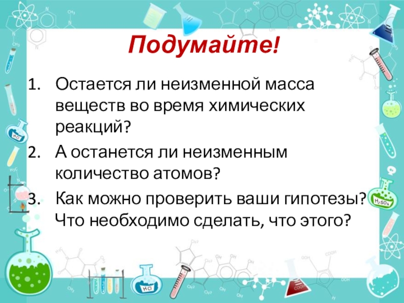 Подумайте!Остается ли неизменной масса веществ во время химических реакций?А останется ли неизменным количество атомов?Как можно проверить ваши