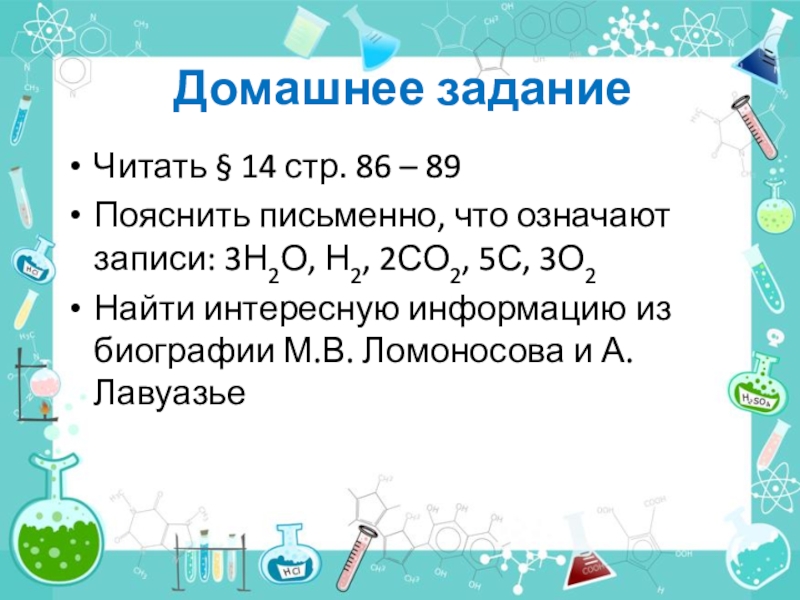 Домашнее заданиеЧитать § 14 стр. 86 – 89Пояснить письменно, что означают записи: 3Н2О, Н2, 2СО2, 5С, 3О2Найти
