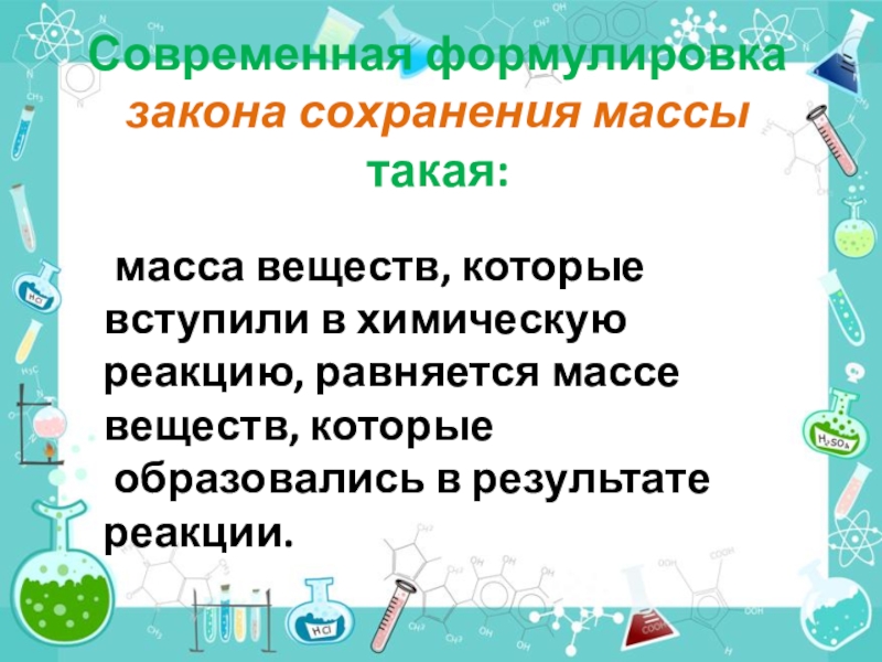 Слайд 5Современная формулировка закона сохранения массы такая: