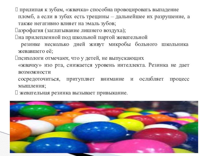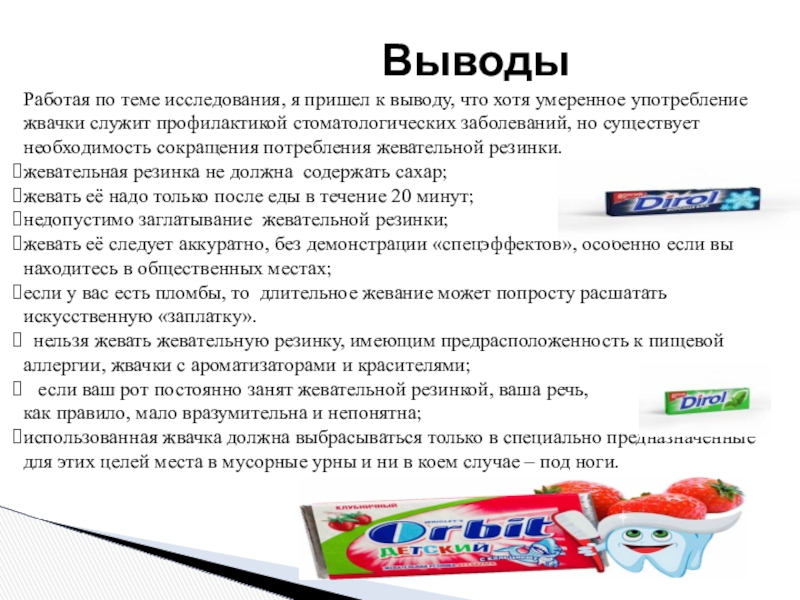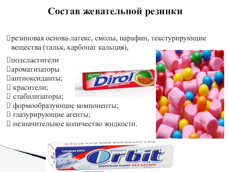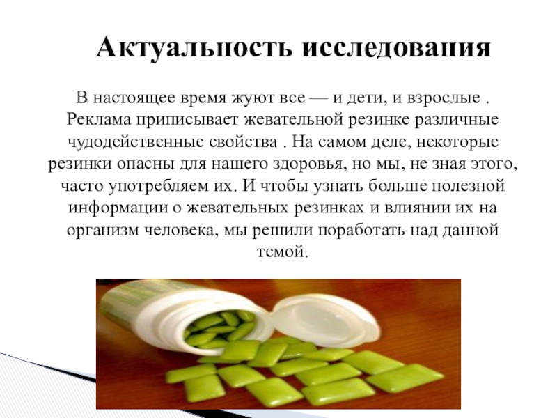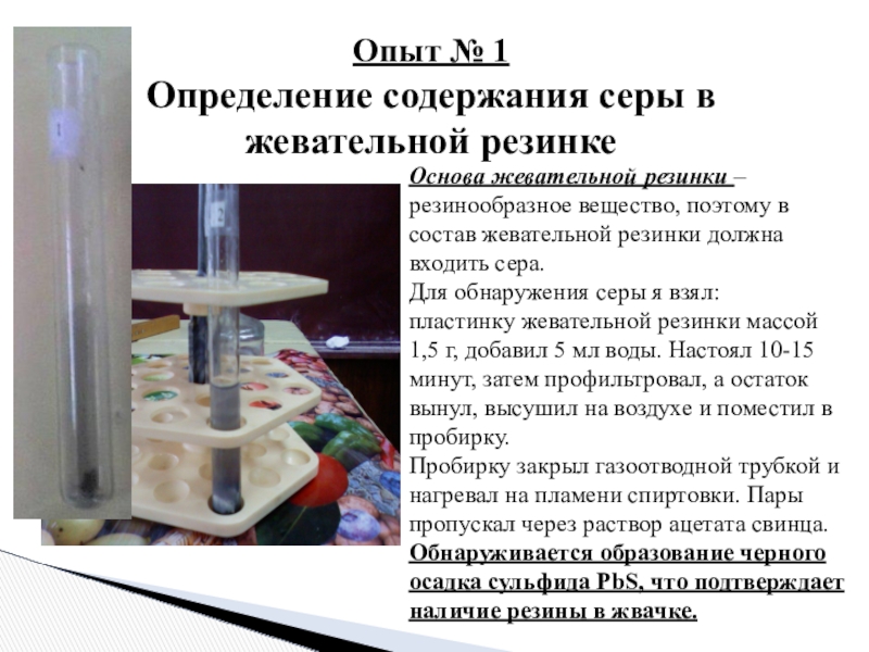 Основа жевательной резинки – резинообразное вещество, поэтому в состав жевательной резинки должна входить сера. Для обнаружения серы я взял: пластинку жевательной резинки массой 1,5 г, добавил 5 мл воды. Настоял 10-15 минут, затем профильтровал, а остаток вынул, высушил на воздухе и поместил в пробирку. Пробирку закрыл газоотводной трубкой и нагревал на пламени спиртовки. Пары пропускал через раствор ацетата свинца. Обнаруживается образование черного осадка сульфида PbS, что подтверждает наличие резины в жвачке.