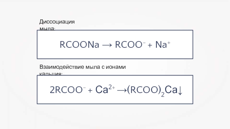 RCOONa → RCOO- + Na+Диссоциация мыла:Взаимодействие мыла с ионами кальция:2RCOO- + Са2+ →(RCOO)2Са↓