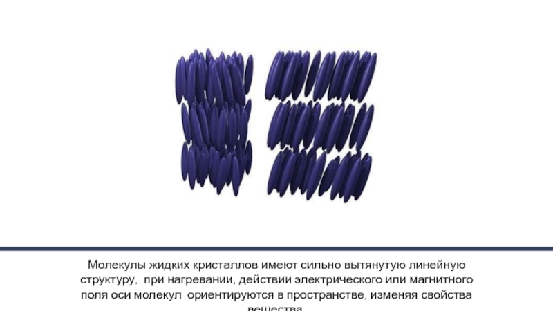 Молекулы жидких кристаллов имеют сильно вытянутую линейную структуру, при нагревании, действии электрического или магнитного поля оси молекул