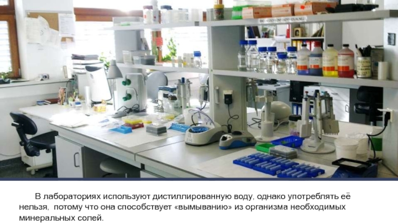 Слайд 15В лабораториях используют дистиллированную воду, однако употреблять её нельзя, потому что