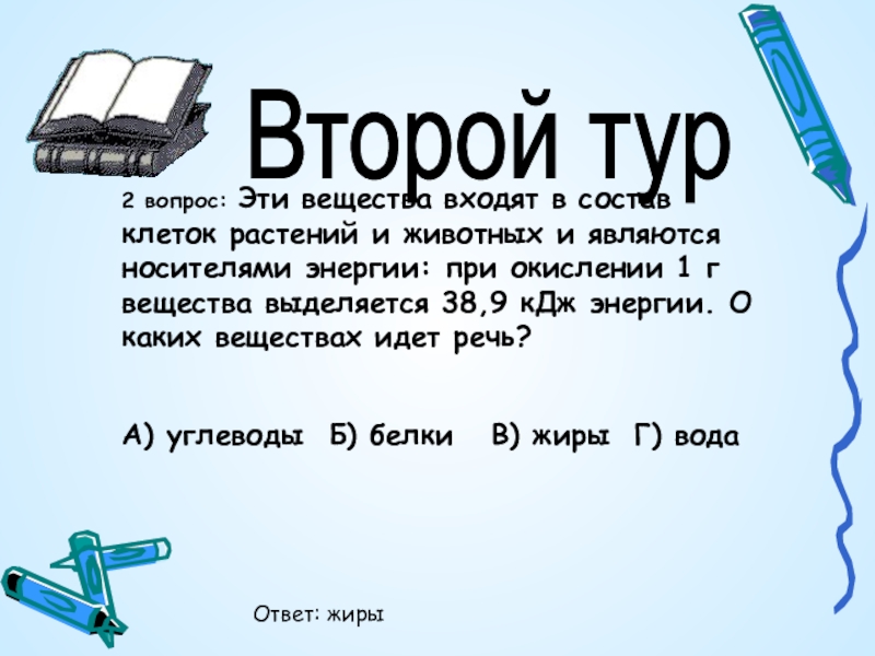 1.Первый тур (участвуют 4 команды): четыре вопроса. В каждом вопросе по 4 варианта ответа.
