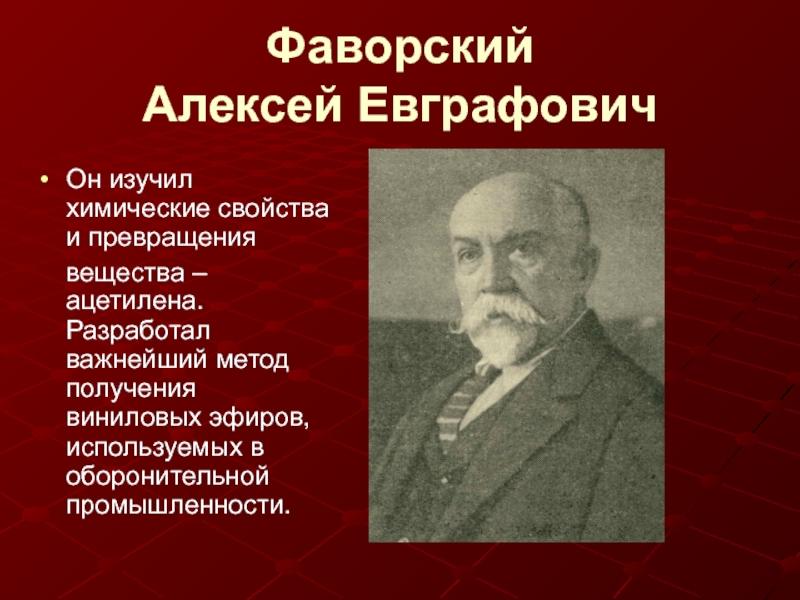 – ацетилена. Разработал важнейший метод получения виниловых эфиров, используемых в оборонительной промышленности.