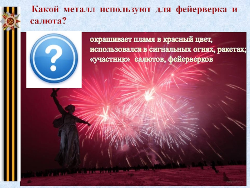 Стронций-металл фейерверков и салютов. Соединения стронция применяют в пиротехнике для получения красных огней.