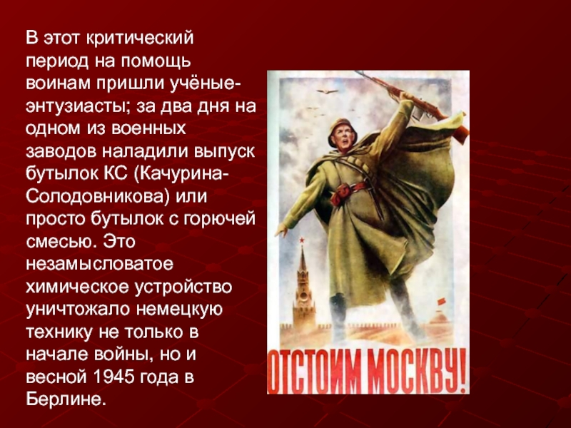 дня на одном из военных заводов наладили выпуск бутылок КС (Качурина-Солодовникова) или просто бутылок с горючей смесью. Это незамысловатое химическое устройство уничтожало немецкую технику не только в начале войны, но и весной 1945 года в Берлине.