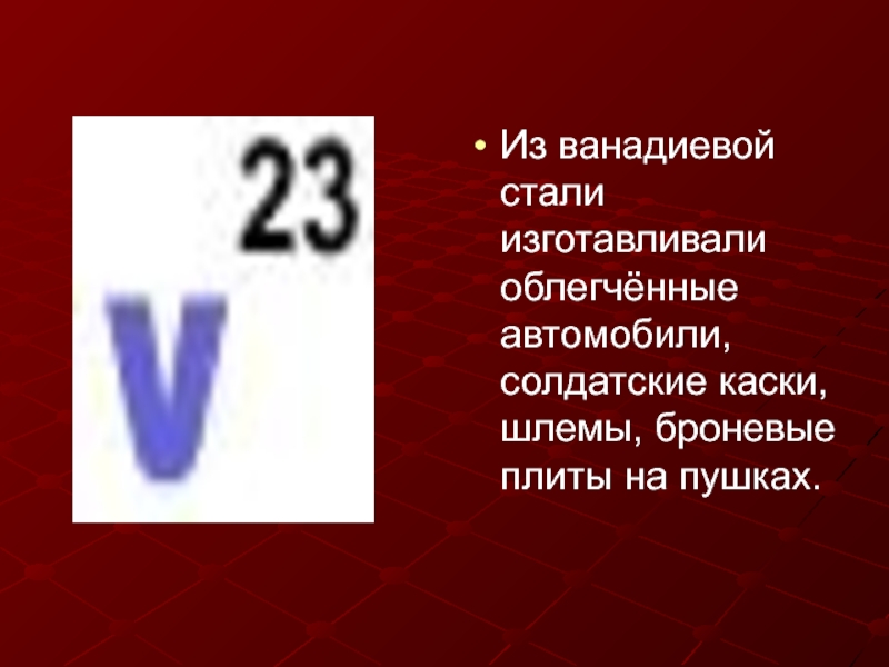 Слайд 26Из ванадиевой стали изготавливали облегчённые автомобили, солдатские каски, шлемы, броневые плиты