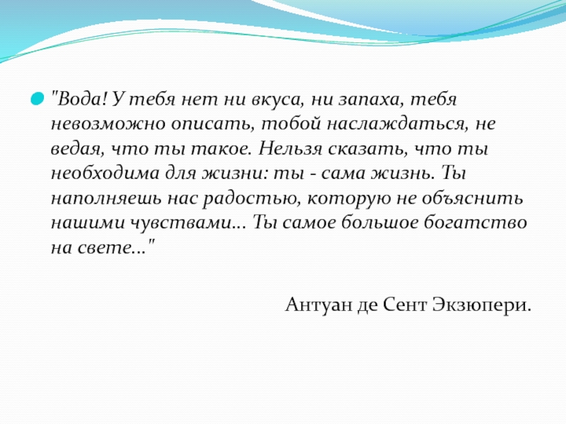 Слайд 3"Вода! У тебя нет ни вкуса, ни запаха, тебя невозможно описать,