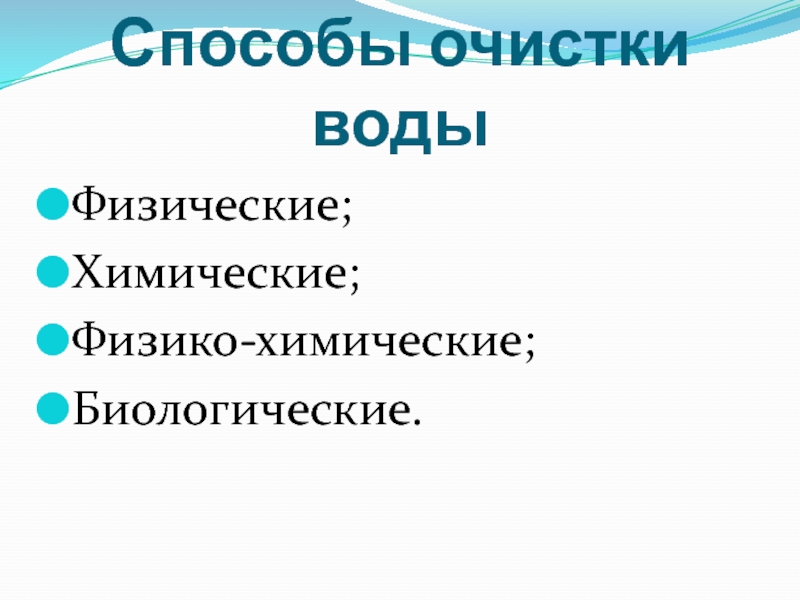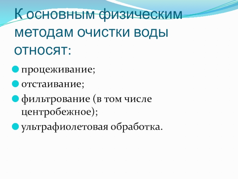 Слайд 12К основным физическим методам очистки воды относят: