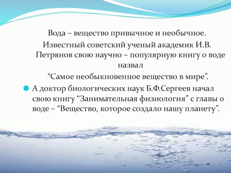 А доктор биологических наук Б.Ф.Сергеев начал свою книгу “Занимательная физиология” с главы о воде – “Вещество, которое создало нашу планету”.