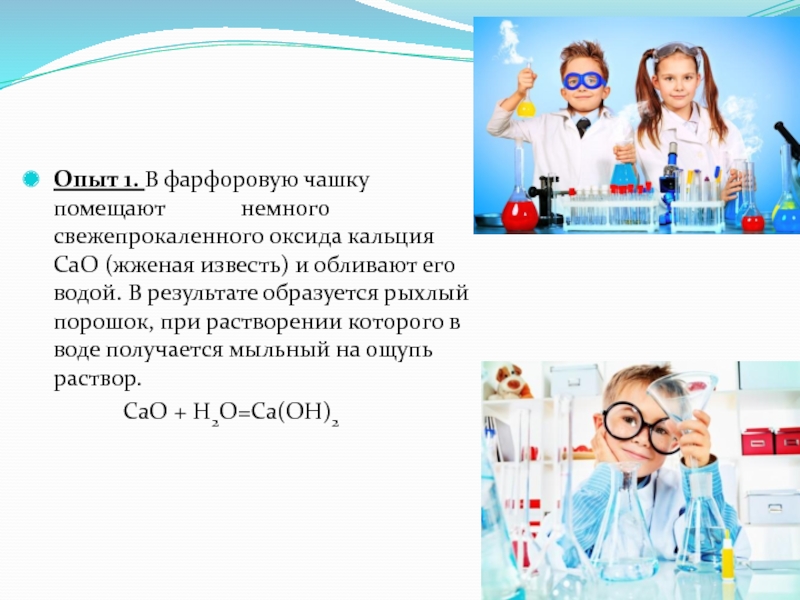 немного свежепрокаленного оксида кальция CaO (жженая известь) и обливают его водой. В результате образуется рыхлый порошок, при растворении которого в воде получается мыльный на ощупь раствор.
