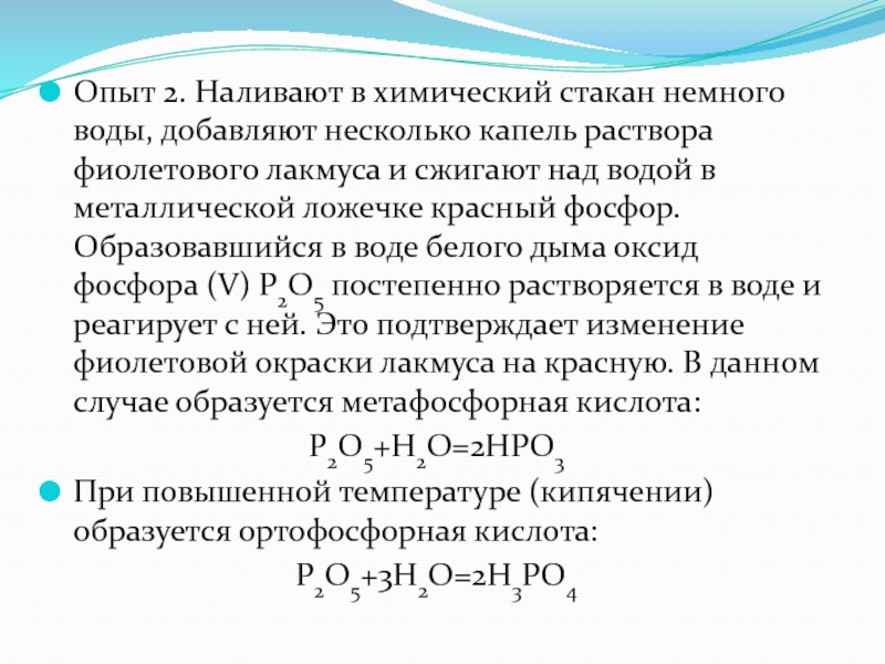 раствора фиолетового лакмуса и сжигают над водой в металлической ложечке красный фосфор. Образовавшийся в воде белого дыма оксид фосфора (V) P2O5 постепенно растворяется в воде и реагирует с ней. Это подтверждает изменение фиолетовой окраски лакмуса на красную. В данном случае образуется метафосфорная кислота: