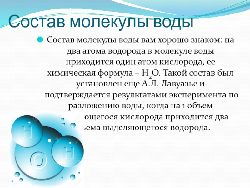 водорода в молекуле воды приходится один атом кислорода, ее химическая формула – Н2О. Такой состав был установлен еще А.Л. Лавуазье и подтверждается результатами эксперимента по разложению воды, когда на 1 объем выделяющегося кислорода приходится два объема выделяющегося водорода.