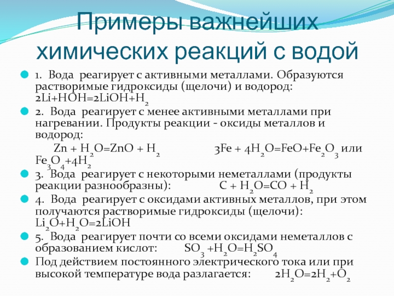 Слайд 10Примеры важнейших химических реакций с водой