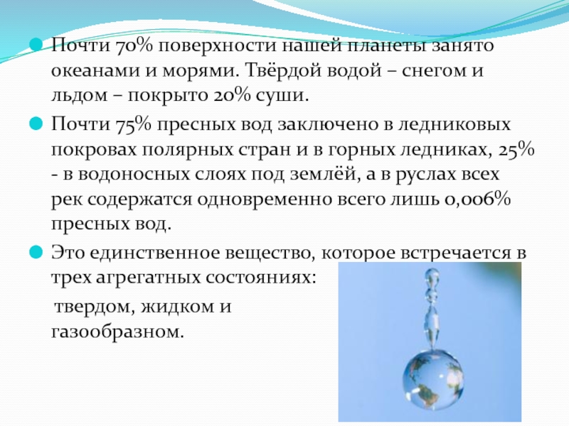 Слайд 4Почти 70% поверхности нашей планеты занято океанами и морями. Твёрдой водой