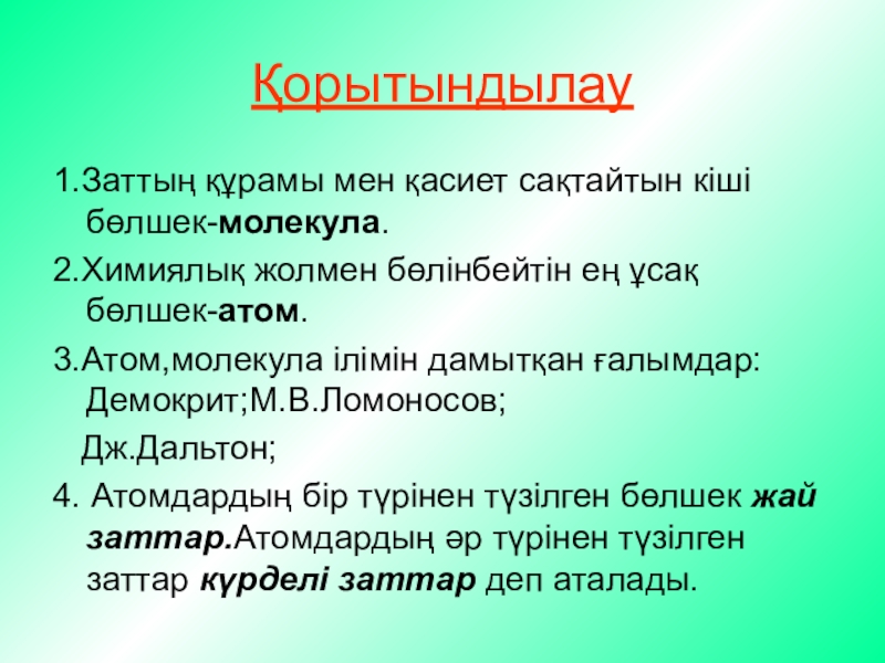 “Барлық денелер өте ұсақ көзге көрінбейтін әрі бөлінбейтін, мәнгі қозғалыста болатын бөлшектер – атомдардан тұрады”- деген болжам айтты( 25000 жыл бұрын) Грек философы Демокрит.